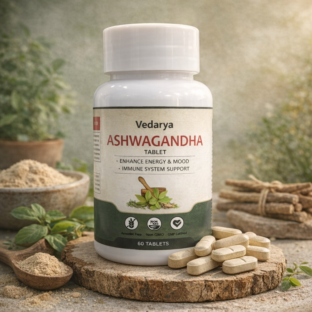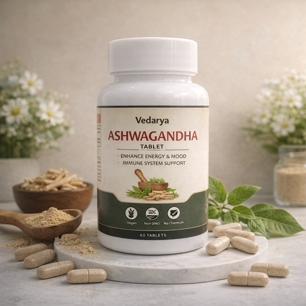Vedarya Ashwagandha Tablets are a premium Ayurvedic food supplement formulated to support overall mental and physical well-being. Made from high-quality Ashwagandha extract, this powerful adaptogen helps the body manage daily stress while promoting calmness, focus, and balance.